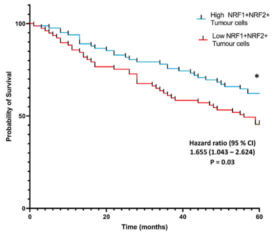 Figure 4. Kaplan–Meier survival analysis of the density of NRF1 and NRF2 co-expressed cancer cells. Population-based Kaplan–Meier five-year survival analysis demonstrates the association between NRF1+NRF2+ co-expressing tumor cells and the probability of survival. Statistical significance was assessed using the log-rank test (Mantel–Cox). (p * < 0.05).