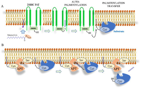 An increasing number of studies on palmitoylation of proteins have revealed that APT1 and APT2 are not the only thioesterases in cells. At least 19 members of the mammalian α/β hydrolase domain protein family are thought to have depalmitoylase functions, including ABHD17A, ABHD17B, and ABHD17C depalmitoylases [156]. These proteins contain multiple conserved cysteine residues near their N-terminus, which can regulate the palmitoylation of N-Ras. In addition, palmitoylthioesterase 1 and 2 (PPT1/2) are proteins found in the lysosomes, where they deacylate palmitoylated proteins. The process of palmitoylation is depicted in Figure 3.