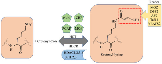 - Wang, S.; Mu, G.; Qiu, B.; Wang, M.; Yu, Z.; Wang, W.; Wang, J.; Yang, Y. The Function and related Diseases of Protein Crotonylation. Int. J. Biol. Sci. 2021, 17, 3441–3455. [Google Scholar] [CrossRef]