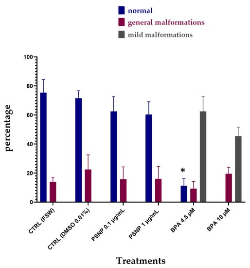 The percentage (%) of normal hatched larvae (blue), larvae with general malformations (red) and with mild malformations (reduced pigmentation of otolith and ocellus, grey) upon single exposure of 22 hpf to PS NPs (0.1 µg/L and 1 µg/L) and BPA (4.5 and 10 µM) in FSW. Bars show values expressed as mean ± Standard Deviation. * indicates values that are significantly different compared to controls (2-way ANOVA, p < 0.05).