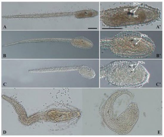 PS NPs did not cause any significant effect on the development of C. robusta embryos at both concentrations tested (0.1 and 1 µg/mL), with only a slight increase in the % of undeveloped embryos compared to the controls (Figure 1; Table 2). Conversely, larvae exposed to BPA, as previously reported [34] showed two types of malformations: (i) a reduced pigmentation of both otolith and ocellus (62.46% at 4.5 µm and 45.38% at 10 µM) (Table 2, Figure 1, mild malformations), the two pigmented sensory organs present in the brain vesicle (Figure 2—C’ compared to the controls A,A’); (ii) a general compromised development with a shorter, kinked and disorganized tail and an altered trunk morphology (Table 2, Figure 1, general malformations) (Figure 2D,E). Furthermore, at the highest concentration of BPA, there was a significant percentage of undeveloped embryos, compared to BPA 4.5 µM (Table 2).