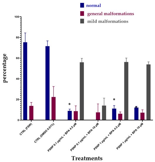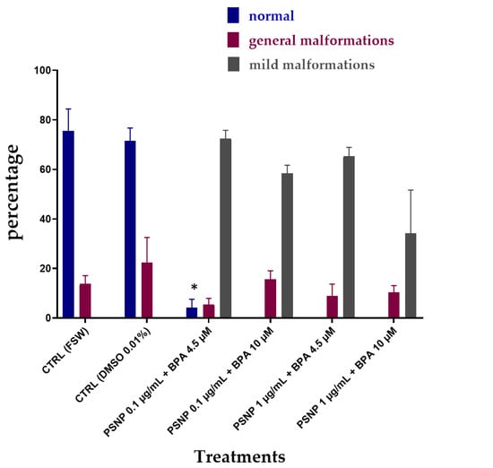 The percentage (%) of C. robusta larvae normally hatched with general malformations (red) and with mild malformations (grey) upon combined exposure without pre-incubation (T0) to PS NPs and BPA in FSW. Bars show mean ± Standard Deviation. * indicates values that are significantly different compared to the controls (2-way ANOVA, p < 0.05).