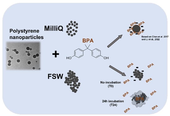 A diagram showing the possible interaction between PS NPs and BPA in MilliQ and FSW based on DLS data and biological findings. Refer to Chen et al., 2017 and Li et al., 2022 [35,43].