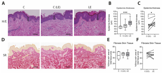 In our study, we compared biopsies of lymphedematous and non-lymphedematous tissue from patients with secondary lymphedema versus anatomically matching control patients. Changes in skin thickness have been shown to correlate with lymphedema severity [17]. In our study, an increased epidermal thickness was observed in the edematous tissue of lymphedema patients (healthy control [C]: 57.55 ± 4.80 µm versus non-lymphedematous tissue [C(LE)]: 63.78 ± 12.70 µm versus lymphedematous tissue (LE): 76.39 ± 12.4 µm). The significant increase was visible in the unpaired analysis compared to the control group (p = 0.0008) as well as the paired comparison between the edematous and non-edematous tissue of lymphedema patients (p = 0.02). Cutaneous fibrotic tissue deposition was assessed by the quantification of Sirius Red staining, which showed no significant alteration (Figure 1).