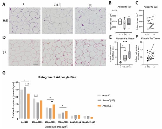 Increased fibrosis in lymphedema. (A,D) Hematoxylin/eosin (H/E) and Sirius Red stains (SR) of paraffin-embedded fat sections were used to evaluate the collagen deposition stained in red. (B) Quantification of the adipocyte size among the three groups using the H/E sections revealed no changes in the adipocyte size. (C) A paired comparison of the adipocyte size in non-edematous and edematous fat tissue in lymphedema reveals comparable adipocyte size in both locations. (E) Quantification of collagen deposition was performed using SR-stained sections, indicating increased collagen deposition in both the non-edematous and edematous tissue in lymphedema. (F) A paired comparison of collagen content in non-edematous and edematous fat tissue in lymphedema reveals a trend towards increased fibrosis, without reaching statistical significance. (G) Histogram presentation of the adipocyte size ranges of the lymphedematous, non-lymphedematous and healthy control adipose tissue. The analysis reveals a comparable size distribution across the three groups but significantly higher numbers of large adipocytes in lymphedematous tissue. Scale bar: 100 µm. Asterisks indicate statistical significance; * p < 0.05, ** p < 0.01 and *** p < 0.001. (For the comparison to the healthy control, an ANOVA test followed by a Fischer’s LSD test was used. For the comparison of the edematous and the non-edematous tissue from the same patient, a paired Student’s t-test was used. For the adipocyte size distribution, a Fisher’s exact test was performed). C: Control, C(LE): control from non-lymphedematous tissue from lymphedema patients, LE: lymphedematous tissue.