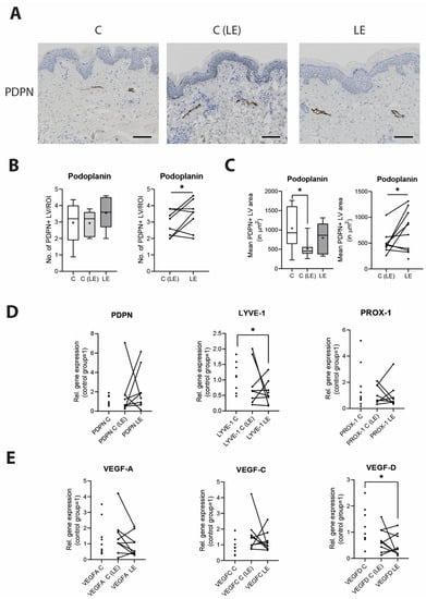 Morphological and gene-expression changes of lymphatic vessels in lymphedema. (A–C) Histological evaluation of the lymphatic vessels on skin sections using podoplanin/PDPN revealed distinct changes in the number, size of lymphatic vessels between tissue from control tissue, non-lymphedematous and lymphedematous tissue from lymphedema patients, with a significant increase in the number and size of lymphatic vessels in lymphedematous tissue. (D,E) The evaluation of the PDPN, LYVE-1, PROX-1, VEGF-A, VEGF-C and VEGF-D expression in fat tissue decreased the LYVE-1 and VEGF-D expression in the lymphedematous tissue. Scale bar: 100 µm. Asterisks indicate statistical significance; * p < 0.05 (for the comparison to the healthy control, an ANOVA followed by a Fischer’s LSD test was used. For the comparison of the edematous and the non-edematous tissue from the same patient, a paired Student’s t-test was used). C: Control, C(LE): control from non-lymphedematous tissue from lymphedema patients, LE: lymphedematous tissue.