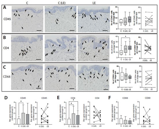 An increased CD4+ cell infiltrate characterizes lymphedema. (A–C) The immune cell infiltration of CD45+ (leucocytes), CD4+ (CD4+ T helper cells) and CD68+ (macrophages) cells was evaluated on paraffin-embedded tissue sections. The arrows indicate the CD45-, CD4- and CD68-positive cells, respectively. The quantification of the CD45+, CD4+ and CD68+ cells reveals an increased infiltration of CD4+ cells in the lymphedematous tissue. (D–F) The evaluation of the CD45, CD4, CD68 expression in fat tissue. Scale bar: 100 µm. Asterisks indicate statistical significance; * p < 0.05. For the comparison with the healthy control, an ANOVA followed by a Fischer’s LSD test was used. For the comparison of the lymphedematous and the non-lymphedematous tissue from the same patient, a paired Student’s t-test was used. C: Control, C(LE): control from non-lymphedematous tissue from lymphedema patients, LE: lymphedematous tissue.