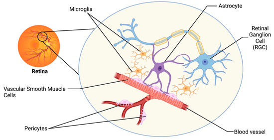The visual system has developed intricate regulatory mechanisms to fulfill the high metabolic demand of the retina. One such mechanism is neurovascular coupling (NVC), whereby an increased neuronal activity promotes signaling between cells of the neurovascular unit (NVU), resulting in increased supply of metabolites and removal of waste products by the vasculature [12]. The retinal NVU consists of three main cell types: neurons, glial cells (including astrocytes, microglia, and oligodendrocytes), and vascular cells (endothelial cells, vascular smooth muscle cells, and pericytes; Figure 1) [13]. Dysfunction in the NVU is evident in the pathophysiology of many neurodegenerative diseases of the central nervous system (CNS), including Alzheimer’s Disease and Parkinson’s Disease [3]. Such neurodegenerative diseases share many common pathophysiologies with glaucoma, and thus dysfunction in the NVU may also be a relevant mechanism of neurodegeneration of the visual system [3,13].