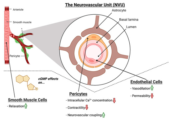 The nitric oxide-cyclic guanosine monophosphate (NO-cGMP) signaling pathway is integral to NVC mechanisms and is the prime mediator of vasodilation in endothelial cells [9]. NO is produced by nitric oxide synthase enzymes in cells of the NVU in both physiological and pathophysiological conditions [17]. NO is lipophilic and can freely traverse cellular membranes, where it binds to its primary receptor, soluble guanylate cyclase (GC1; [18,19]). GC1 binding of NO stimulates the production of cGMP, a second messenger capable of binding to multiple cellular protein targets such as cyclic nucleotide phosphodiesterases (PDEs), cGMP-dependent protein kinases, and cGMP-gated ion channels [20,21,22,23]. cGMP signaling is multifaceted, with the potential to exert broad effects on cellular physiology, depending upon the cellular target that it binds.