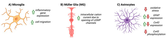 The known effects of cGMP on glial cells. Red arrows represent downregulation, or negative activity, green arrows represent increased expression, or positive activity. (A) cGMP upregulates inflammatory gene expression and cell migration in microglia, (B) increases cation current within Müller cells via opening of cGMP-gated channels, and (C) decreases oxidative stress, differentially affects GFAP and Cx43 expression, and decreases Cx43 phosphorylation in astrocytes.