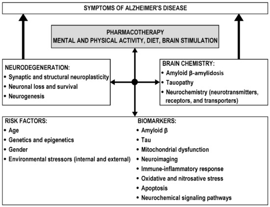 AD is classified as an Aβ and tau pathology leading to neurodegeneration and cognitive impairment [26,27]. The onset of AD and disease progression are determined by a combination of environmental and genetic risk factors and biomarkers, resulting in disturbances in various brain areas and neurocircuits, neurodegeneration, and impaired neuroplasticity and neurochemistry, which are responsible for disease symptoms (Figure 1).