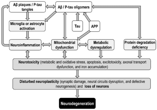 Progressive neurodegeneration in AD (the loss of synapses and neurons and damage to certain neural circuits in the brain) leads to cognitive dysfunction and dementia. Common mechanisms involved in neurodegeneration in AD include proteinopathy, with Aβ and tau as the major aggregation proteins. Neurodegeneration in neurodegenerative diseases is commonly affected by (1) environmental factors, such as age, diet, exercise, lifestyle, and cognitive reserve; (2) metabolic and oxidative stress; (3) genetics and epigenetics; (4) cerebrovascular dysfunction and blood–brain barrier disorder; (5) neurotoxicity; and (6) neuroinflammation associated with activation of glial cells and/or infiltration of peripheral immune cells and cytokines [151]. Several AD hypotheses have been formulated with focus on various molecular mechanisms underlying the pathophysiology of the disease. Currently, the most attention is paid to the amyloid, tau, neurotransmitter, and mitochondrial cascade hypotheses. Neurovascular, exercise, inflammatory, diabetes, viral, and other AD hypotheses have also been discussed in clinical trials [152,153].