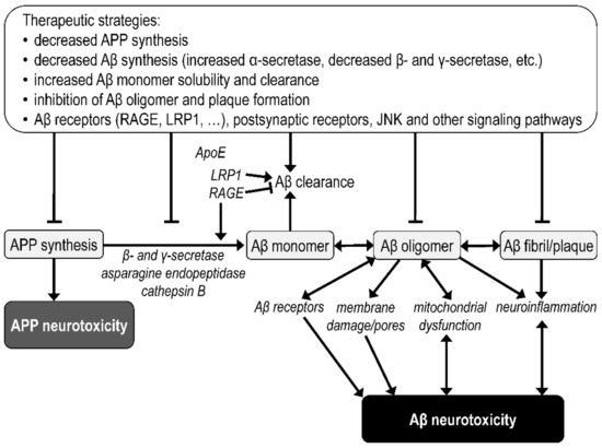 The amyloid beta aggregation pathway, neurotoxicity triggers, and related therapeutic strategies. Aβ—amyloid beta; ApoE—apolipoprotein E; APP—amyloid precursor protein; LRP1—low density lipoprotein receptor-related protein 1; RAGE—receptor for advanced glycation end products.