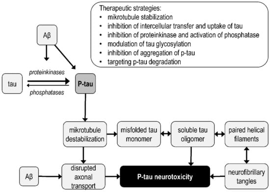 The most significant protein interaction that enhances tau pathology is the interaction with Aβ. Aβ facilitates the phosphorylation, aggregation, mislocalization and accumulation of tau. Mechanisms by which Aβ may enhance tau pathology, leading to neurodegeneration, include activation of specific protein kinases (e.g., GSK-3, Cdk5, and Fyn kinase), neuroinflammation-modulated tau phosphorylation, inhibition of tau degradation by the proteasome, and interactions affecting axonal transport [207]. Aβ and tau appear to act in a synergistic manner, and thus, their effect on neurodegeneration and AD progression is not solely due to additive effects of Aβ and tau [193,208]. The connection between the action of Aβ oligomers and tau hyperphosphorylation can be realized, for example, through the interaction of Aβ oligomers with the complex receptor cellular prion protein/mGluR5, which leads to the activation of Fyn kinase [209]. In addition to Aβ, α-synuclein, some heat shock proteins, immunophilins, cytoplasmic adapter proteins, and peptidyl-prolyl isomerase (Pin1), which regulates Cdk5 dephosphorylation of phosphorylated tau, also regulate tau pathology [202]. Targeting P-tau toxicity and protein interactions that influence tau pathology may be an effective strategy in the development of new AD drugs. For example, a therapeutic target may be the c-Jun N-terminal kinase (JNK) signaling pathway, which phosphorylates APP and tau, and whose sustained activation leads to neurodegeneration [210].