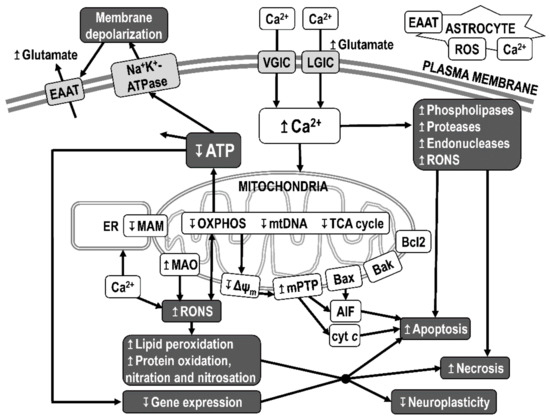Mitochondrial dysfunction leading to neurodegeneration. The mitochondria-driven processes leading to neuronal damage and cell death are reduced ATP production, increased production of reactive oxygen and nitrogen species (RONS), initiation of apoptotic processes, and disturbed calcium homeostasis. Decreased ATP production leads to disruption of ATP-dependent processes, including restoration and maintenance of membrane potential. Membrane depolarization alters the function of excitatory amino acid transporters and leads to the activation of voltage-gated ion channels (VGICs) and ligand-gated calcium channels (LGICs) and to increased Ca2+ entry into the cell. Intracellular calcium acts as a second messenger for the activation of a number of cellular processes and is transported from the cytosol by ion pumps to the extracellular space, to the endoplasmic reticulum (ER), and to the mitochondrial matrix. An excessive concentration of cytosolic free Ca2+ can have a neurotoxic effect by increasing the activation of phospholipases, proteases, and endonucleases. Excessive accumulation of Ca2+ in the mitochondrial matrix causes a decrease in the membrane potential on the inner mitochondrial membrane (Δψm), a decrease in ATP production, an increase in the production of reactive oxygen species (ROS), the opening of mitochondrial permeability transition pores (mPTPs), and the release of cytochrome c (cyt c) and other pro-apoptotic factors (triggering caspase-dependent apoptosis) and of apoptosis-inducing factor (AIF) (triggering caspase-independent apoptosis). Mitochondria in the brain are also a target of nitric oxide. Bax, Bak, Bad—Bcl-2 family proapoptotic factors; Bcl-2—Bcl-2 family antiapoptotic factor; EAAT—excitatory amino acid transporter; MAM—mitochondria-associated ER membrane; MAO—monoamine oxidase.
