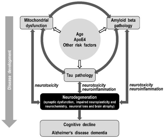 The model of dynamic AD biomarkers [26,142] captures the biomarker magnitude depending on the clinical AD stage and is based on the longitudinal measurement of (i) amyloid pathology (Aβ42 in CSF and PET Aβ imaging), (ii) tau pathology (P-tau and T-tau in CSF), (iii) synaptic dysfunction (FDG-PET and fMRI), (iv) brain structure and neurodegeneration (volumetric MRI), and (v) clinical parameters (cognitive decline and dementia). The model assumes that carriers of the APOE ε4 allele may have an earlier onset of the Aβ-initiated cascade of pathophysiological processes. Attention is paid to the age-related development of mitochondrial dysfunction. Thus, threshold crossing of mitochondrial dysfunction, Aβ neurotoxicity, and/or tau neurotoxicity appear to be the best candidates for possible primary triggers of AD onset (Figure 2).