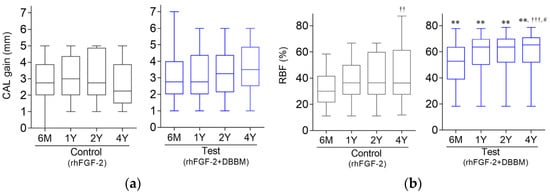 Many RCTs are relatively short-term and, due to various reasons, they are seldom re-visited or extended []. Treatment effects can change beyond the initial or short-time follow-up study. Previously, we reported 2-year follow-up results [] of the 6-month RCT [], but 2-years is a relatively short follow-up period. There are currently no mid-term or long-term data available about the effectiveness of regenerative therapy employing rhFGF-2 and bone substitutes. Therefore, we thought it necessary to evaluate the longitudinal effects of the combined use of rhFGF-2 and DBBM on the healing of intrabony defects, as compared to rhFGF-2. The results of the current study showed that the mean CAL gains at 4 years postoperatively (primary endpoint) were 3.5 mm in the test group and 2.7 mm in the control group, with no significant intergroup differences. This finding is consistent with the results from our 2-year follow-up study [] and studies comparing the use of EMD alone versus EMD plus bone substitutes [,]. The 4-year outcomes reported here suggest that rhFGF-2 alone and rhFGF-2 plus DBBM were comparably effective in the resolution of intrabony defects in the treated patients. Given that the rhFGF-2 formulation itself lacks space-making property, the favorable results from the use of rhFGF-2 alone (with no addition of bone substitutes or membranes) may further support the clinical efficacy of rhFGF-2 therapy.