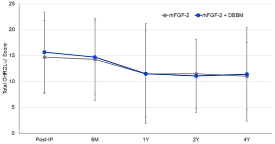 Compared with the mean total OHRQL-J score following IP, neither treatment yielded significant changes in scores over time (Figure 3). No significant intergroup difference in scores was found at any timepoint.