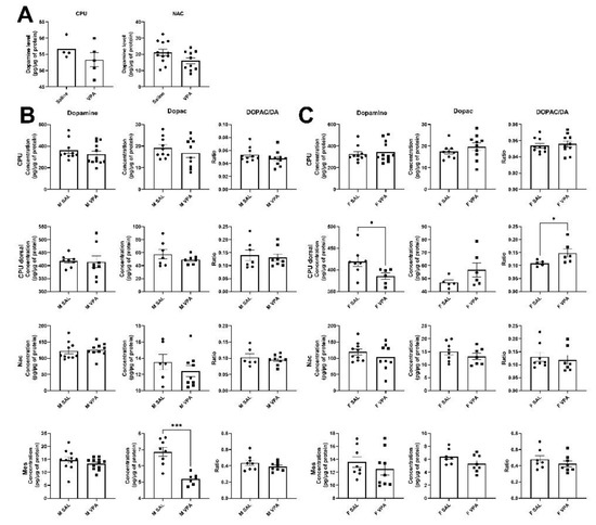 Given the stable number of dopamine neurons and TH protein levels within the mesolimbic and nigrostriatal pathways, we aimed to measure dopamine and metabolite levels within these pathways. We first measured dopamine levels by HPLC in saline and VPA male mice and found no alteration within the striatum or the nucleus accumbens (Figure 2A). We next explored levels of dopamine and metabolites within the ventral mesencephalon (Mes), the nucleus accumbens (Nac), the whole striatum (CPU), and the dorsal striatum (CPU dorsal) using the more sensitive mass spectrometry procedure in separate groups of male and female mice (Figure 2B,C). We found that female VPA mice showed a slight decrease in the levels of dopamine within the dorsal CPU (p < 0.05) associated with an increase in the DOPAC/DA ratio (p < 0.05) that generally indicates a higher turnover rate of dopamine metabolism. No other alteration in the levels of dopamine, DOPAC, HVA, and 3-MT in any of the brain regions explored was found.