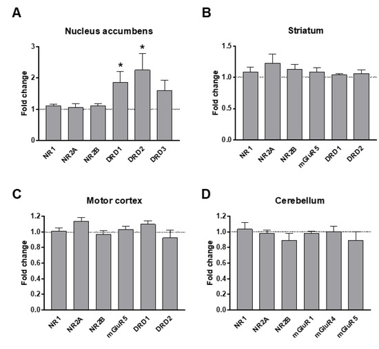 We measured mRNA levels of major dopamine and glutamate receptors within target brain areas that are suspected to be implicated in major ASD social and motor symptomatology: the nucleus accumbens (Figure 3A), the striatum (Figure 3B), the motor cortex (Figure 3C), and the cerebellum (Figure 3D). We found a two-fold increase in mRNA levels of D1 and D2 dopamine receptors (DRD1 and DRD2 respectively) within the nucleus accumbens (Figure 3A). This could indicate an upregulation of the corresponding receptors as a compensation for the observed decrease in dopamine levels.