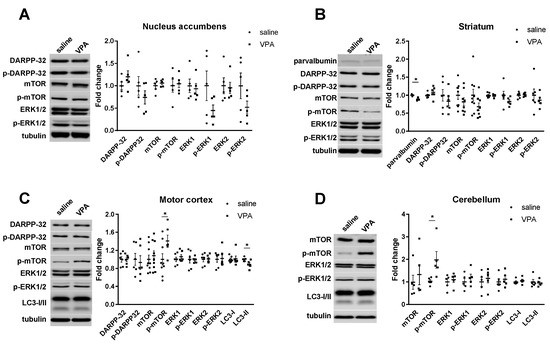 We also analyzed levels of TrkB and its truncated isoform TrkB-T1 (Figure 4) and of phosphorylated and non-phosphorylated Erk1 and 2, mTOR and Akt as these receptors and signal transduction effectors are highly regulated in relation with neuronal plasticity and thus are recognized indicators of alterations in neuronal signaling [46]. We found increased levels of p-mTOR in the motor cortex (Figure 5C) and the cerebellum (Figure 5D) but no further alteration in the levels of other proteins investigated whether in their phosphorylated or non-phosphorylated forms within the striatum, the nucleus accumbens, the motor cortex, or the cerebellum (Figure 5). We also investigated levels of striatal parvalbumin (PV) as PV interneurons provide the strongest inhibitory inputs to striatal medium spiny neurons (MSNs) and are in charge of the feed forward inhibition. In addition, PV levels were decreased in ASD patients [47] and in genetic ASD animal models [48]. We confirm these findings and report a slight decrease in PV striatal protein levels in the VPA ASD mouse model (Figure 5B).