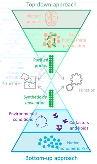 An outline of the top-down and bottom-up approach for investigating prions. The top-down approach has largely been achieved, with the high resolution structures of two prion strains having been recently solved [], as well as many more structures of other amyloid classes []. The bottom-up approach starts from simplified components and aims to produce a prion with the same structure and biological activity as the brain-derived prions. This approach requires identification of any potential co-factors, and so provides further understanding of the disease process. It allows for modulation of the process by adding potential inhibitors or accelerators, and so contributes to the development of therapeutics.