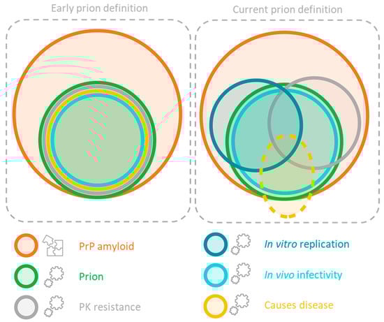 Prions are made up of alternatively folded conformers of the prion protein PrP, which form a cross-β amyloid as opposed to the α-helices found in the native PrPC conformer. As discussed in the introduction, two prion strain structures recently solved have a parallel in register intermolecular β-sheet (PIRIBS) structure [,]. While the two strains show some subtle differences, they have the PIRIBS structure in common, so it is likely that having a PIRIBS structure is a requirement for a prion. Prions typically have some level of Proteinase K (PK) resistance, and are highly stable under various denaturing conditions []. Prions are defined by their biological activity: they must cause transmissible disease in animals. There are however many facets to the term ‘transmissible disease’, including infectivity and toxicity, which must be carefully considered. After all, to be able to determine if a synthetic prion has been made, one must first know what a prion is or, at the very least, what a prion is not. The three traits of infectivity, toxicity and PK resistance are a good place to start when discussing what is and is not a prion. Figure 2 shows how the definition of a prion involving these traits has changed since initial top-down prion studies as experiments in vitro have produced misfolded PrP species, which shared one or more characteristic traits of prions, whilst lacking infectivity in vivo.