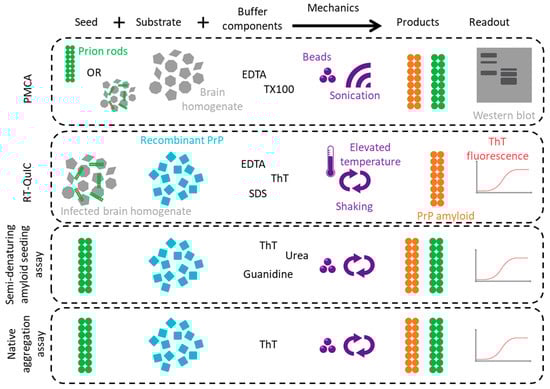 When discussing what constitutes a synthetic prion, and how one can be defined, both the methods to generate synthetic prions and the methods to assess their biochemical and infectious properties must be established. These methods to generate and/or replicate prions in vitro must provide favourable conditions and environments for PrP to convert into the disease-associated state []. Figure 3 outlines the starting components, buffer conditions, physical environment and readout method of each of the four methods discussed here.