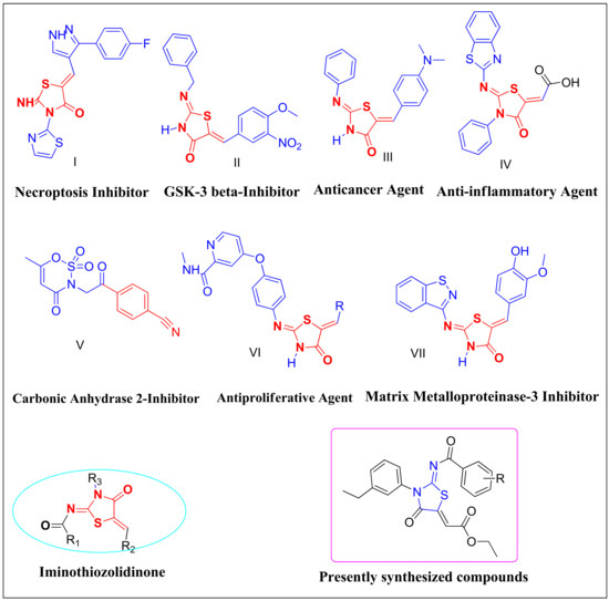 Illustration of pharmacologically important compounds possessing imino-thiazolidinone scaffold [20,21,22,23,24].