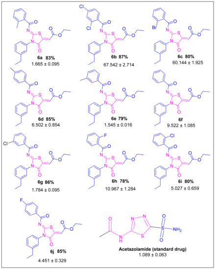 Chemical structures, IC50 values and % yields of synthesized compounds (6a–j) and standard inhibitor Acetazolamide.