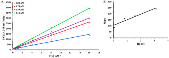 Lineweaver–Burk plots for carbonic anhydrase inhibition in the presence of compound 6e at concentration 0.00, 0.78, 1.55, and 3.11 µM represented by blue-, red-, purple-, and green-colored lines, respectively (A). The insets depict the slope vs. inhibitor 6e concentration plot for determining the inhibition constant (B).