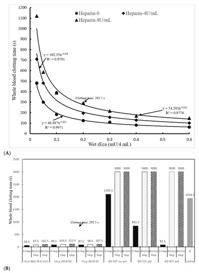 Heparin is the standard hospital based anticoagulant for patients on dialysis (represented by 4 U/mL in our study in vitro and by 8 U/mL when including infrequently used high doses for cardiac patients) [30]. We therefore established a standard curve for the clotting of heparin-spiked blood samples (recalcified citrated whole blood). The results in Figure 3A show that efficient clotting occurs when heparin is present, and even at 8 U/mL of heparin, the clotting is complete in less than 5 min at 0.2 mU of rEcarin. This pattern was observed with separately purified rEcarin samples dried in GBO plain tubes (Figure 3B). In all cases, clotting was achieved in <2 min, even in the presence of 8U/mL heparin, and the process of drying had no effect on clotting times (Figure 3B). The results also reveal dramatic differences between the clotting times for rEcarin, and those in standard SST tubes with or without gel, and in RST tubes in the absence of rEcarin. No clotting was observed at 50 min (3000 s) in all types of commercial tubes (Figure 3B and Figure S4). The results further show that BDRST (thrombin) tubes did not clot the heparin-spiked blood over 3 U/mL whether it was spiked with Li-heparin or Na-heparin (Supplementary Figure S4). Although the BDRST tubes could clot 1 U/mL Li-heparin-spiked blood in 122.5 s, clotting with the 1 U/mL Na-heparin took was over 300 s. Furthermore, in 0.16 mU of N-Ecarin clotted heparinized blood (8 U/mL), hemolysis was again observed, and the clotting time was significantly longer (506 s) compared with the same number of activity units of rEcarin (291 s) (Supplementary Figure S5).