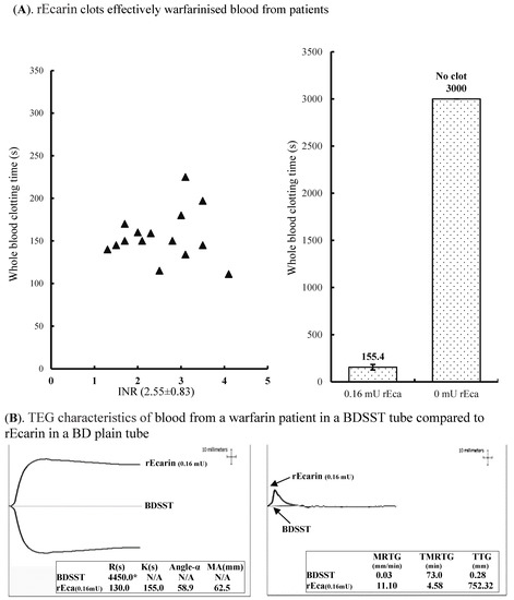 Although ECT is unaffected by prior treatment with warfarin or the presence of phospholipid-dependent anticoagulants, such as lupus anticoagulant [43], ecarin based assays were rarely used for anticoagulation monitoring of the direct oral thrombin inhibitor dabigatran etexilate in 2010 [44]. Here, blood from a patient on dabigatran therapy only showed a soft clot after 80 min in a conventional blood collection tube; however, the presence of 0.15 mU rEcarin caused a firm clot in less than 5 min to produce high-quality serum. In addition to heparin, warfarin and dabigatran, a range of other anticoagulants, such as fondaparinux, apixaban and rivaroxaban, are used clinically [16,45]. Here, we further demonstrated the efficacy of rEcarin in clotting recalcified citrated whole blood spiked with these three anticoagulants at doses significantly higher than clinically used levels.