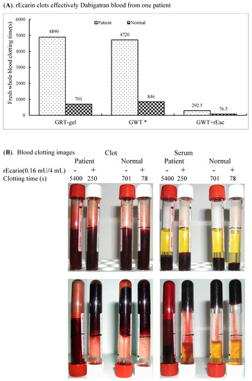 Since the thrombin antagonist dabigatran, which prevents blood clots and stroke in patients with atrial fibrillation, is a widely used anticoagulant [32], we tested the ability of rEcarin (0.16 mU/4 mL blood) to clot a patient’s blood who is prescribed dabigatron. The patient was on a dose of 100 mg of dabigatran with blood collected 5 h after the morning dose for a clotting assay twice a week (Figure 5A,B). With 0.16 mU of rEcarin, the blood from the patient formed a firm clot at 292.5 ± 60.1 s, whereas in its absence, only weak clotting was observed at 4890 ± 721.2 s (Figure 5A). When the clotting images were examined, the effectiveness of ecarin-induced clotting was also evident. (Figure 5B).