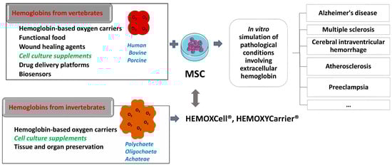 Schematic presentation of the potential use of vertebrates and invertebrates’ hemoglobin preparations in biomedicine and biotechnology (left side of the scheme), emphasizing already commercially available cell culture additives based on invertebrate hemoglobin (HEMOXCell®, HEMOXYCarriers®, HEMARINA SA, Morlaix, France). Up-to-date research on the impact of such hemoglobin preparation on mesenchymal stromal cell (MSC) cultures could significantly contribute to a better understanding of the onset and progression of pathological conditions involving extracellular hemoglobin as presented on the right side of the scheme.