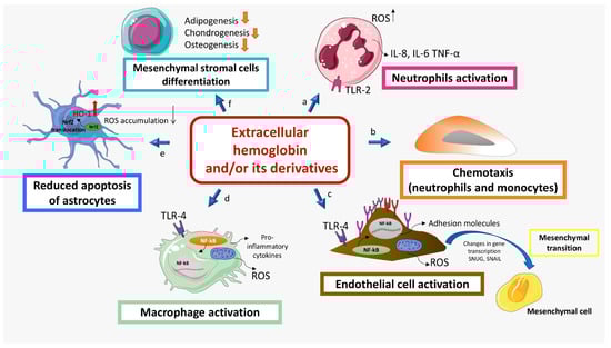 Targets of extracellular hemoglobin and its derivatives relevant for pathophysiology of several diseases (see Section 4). Extracellular hemoglobin and/or its derivatives induce (a) neutrophil activation characterized by elevated ROS production, increased production of pro-inflammatory cytokines, (b) neutrophil and monocytes chemotaxis, (c) endothelial cell activation characterized by NF-κB activation, elevated ROS production, and increased expression of adhesion molecules and pro-inflammatory cytokines. (d) Macrophages elevated ROS production and pro-inflammatory cytokine production, (e) astrocytes reduced ROS accumulation and apoptosis rate characterized by upregulation and nuclear translocation of Nrf2 and HO-1 upregulation, (f) MSC reduced osteogenesis, chondrogenesis and adipogenesis. (NF-κB, nuclear factor kappa B; ROS, reactive oxygen species; TLR2, toll-like receptor 2; TLR4, toll-like receptor 4, Nrf2, erythroid 2 related factor; HO-1 hem oxygenase-1; MSC-mesenchymal stromal cells).