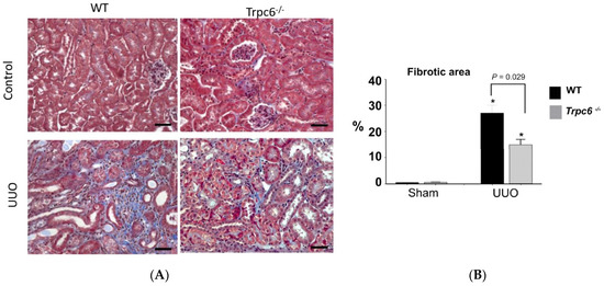 Reduction in renal fibrosis in Trpc6−/− mice following unilateral ureteral obstruction. (A) Histological analysis based on Masson’s trichrome stain. (B) Quantitative analysis of this type of experiment from many animals. Asterisks indicate p < 0.05 compared to sham. Modified from [64] and used with permission.