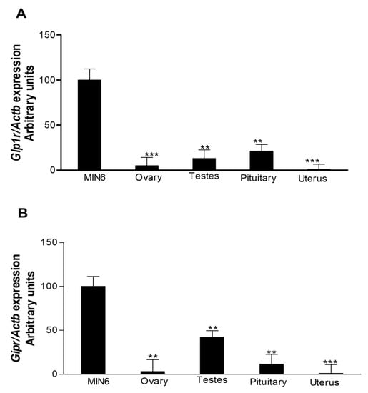 GLP-1 and GIP receptor gene expression in pituitary, ovary and uterine horn of female C57BL/6 mice. Relative mRNA expression (in %) in the pituitary, ovary and uterine horn of C57BL/6 mice. (A) GLP-1R and (B) GIPR mRNA expression. Values are mean ± SEM with n = 4. ** p < 0.01, *** p < 0.001 compared to insulin-secreting MIN6 cells.
