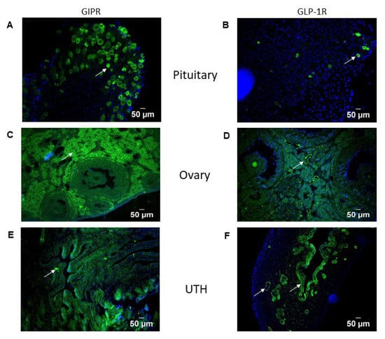 Histological evaluation in female GIPR-Cre and GLP1R-Cre mice revealed expression of both types of incretin receptors in pituitary, ovary and uterine horn (Figure 2A–F). Figure 2A,B shows positive staining for GIP and GLP-1 receptors in anterior pituitary cells. GIP and GLP-1 receptor immunostaining was observed in various parts of ovarian tissue except corpus luteum (Figure 2C,D). Figure 2E shows GIPR immunoreactivity predominantly in the luminal epithelium. Positive staining for GLP-1R is observed in uterine glands, luminal epithelium, intersection zone and stroma as shown in Figure 2F.