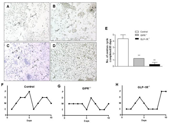 Menstrual stages in normal C57BL/6 mice and effects of GIP- and GLP-1-receptor knockout on estrous cycle. Representative photomicrographs of unstained vaginal smear from control C57BL/6 mice at proestrus ((A), consisting of mostly nucleated epithelial cells), estrus ((B), with predominantly anucleated cornified cells), metestrus ((C), consisting of leukocytes, cornified and nucleated epithelial cells) and diestrus ((D), containing mostly leucocytes). N = Nucleated epithelial cells, C = Cornified epithelial cells and L = Leucocytes. (E) Number of estrous cycles completed in 20 consecutive days. Graphic representation of different stages of first ten days of estrous cycle monitoring of individual (F) control, (G) GIPR−/− and (H) GLP-1R−/− mice. Values are mean ± SEM with n = 4. ** p < 0.01 compared to control.