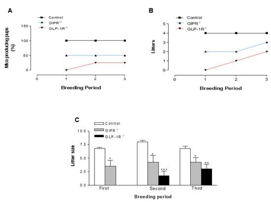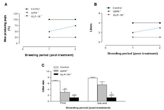 Percentage of animals producing pups, litters and litter size in WT, GIPR−/− and GLP-1R−/− mice. Female (WT, GIPR−/− or GLP-1R−/−) mice (n = 4) were bred with age-matched normal male C57BL/6J mice over three breeding periods of 20 days each. (A) Percentage of mice producing pups, (B) litters produced and (C) average litter size in female WT, GIPR−/− and GLP-1R−/− mice. Litter size corresponds to number of pups in each litter whilst litter refers to number of litters produced. Values are mean ± SEM with n = 4. * p < 0.05, ** p < 0.01, *** p < 0.001 compared to control.