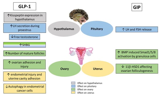 - Jensterle, M.; Janez, A.; Fliers, E.; Devries, J.H.; Vrtacnik-Bokal, E.; Siegelaar, S.E. The role of glucagon-like peptide-1 in reproduction: From physiology to therapeutic perspective. Hum. Reprod. Updat. 2019, 25, 504–517. [Google Scholar] [CrossRef] [PubMed]