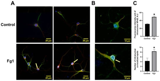 Fibrinogen (Fg)-induced expression of nuclear factor-κB (NF-κB) p65 and its translocation to the nuclei of neurons. Primary mouse brain cortex neurons were treated with 1 mg/mL of Fg (Fg1) or with phosphate-buffered saline (control) for 1 h. (A) Representative images show the translocation of NF-κB p65 (red) to the nuclei of Fg-treated neurons defined with a neuronal marker for microtubule-associated protein 2 (MAP2, green). Colocalization of NF-κB with the cell nuclei marked with 4′,6-diamidino-2-phenylindole (DAPI, blue) shown as white (yellow arrows). (B) Representative images of the same process at a higher magnification. (C) Summary of the fluorescence intensity changes of intranuclear NF-κB staining (upper graph) and the number of spots of co-localized NF-κB and DAPI (lower graph). * p < 0.05 vs. control; n = 3.