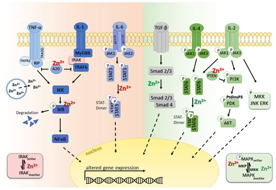 - Lee, H.; Kim, B.; Choi, Y.H.; Hwang, Y.; Kim, D.H.; Cho, S.; Hong, S.J.; Lee, W.W. Inhibition of interleukin-1β-mediated interleukin-1 receptor-associated kinase 4 phosphorylation by zinc leads to repression of memory T helper type 17 response in humans. Immunology 2015, 146, 645–656. [Google Scholar] [CrossRef] [PubMed]