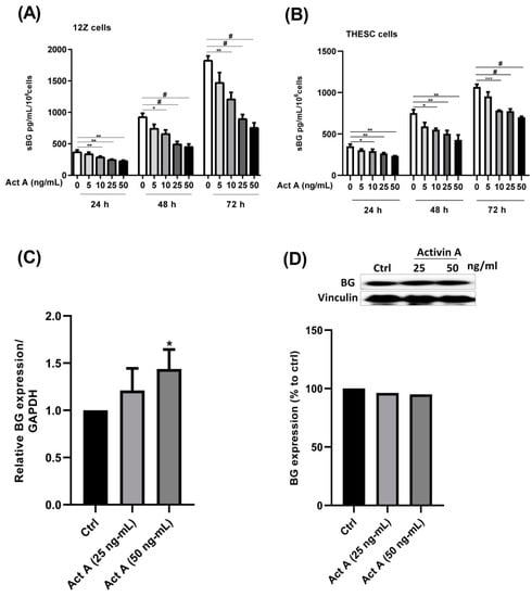 Time- and concentration-dependent effects of activin A on BG shedding and expression in epithelial and stromal cells. Epithelial 12Z (A) and stromal THESC cells (B) were stimulated with increasing concentrations of activin A (5–50 ng/mL) for 24, 48, and 72 h and supernatants were analyzed by sBG ELISAs. The 12Z cells were also treated with 25 and 50 ng/mL of activin A and BG mRNA (C) and protein expression (D) and were analyzed by RT-qPCR and western blot after 2 h and 24 h, respectively. Activin A treatment significantly suppressed BG shedding in a time- and concentration-dependent manner in both epithelial and stromal cells. Moreover, the activin A stimulation significantly increased BG mRNA but had no effect on the BG protein expression. Untreated cells were used as controls. Each bar represents the mean ± SEM of 3 independent experiments performed in duplicate. Dunnett’s test was used for statistical analysis; * p ≤ 0.05; ** p < 0.01; *** p < 0.001; # p < 0.0001; sBG, soluble betaglycan; Act A, activin A.