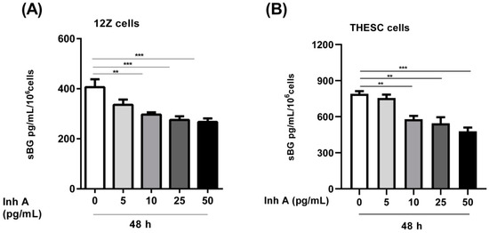 Concentration-dependent effects of inhibin A on BG shedding in epithelial and stromal cells. Epithelial 12Z (A) and stromal THESC cells (B) were stimulated with increasing concentrations of inhibin A (5–50 ng/mL) for 48 h and supernatants were analyzed by sBG ELISAs. Inhibin A treatment significantly reduced BG shedding in 12Z and THESC cells in a concentration-dependent manner. Untreated cells were used as controls. Each bar represents the mean ± SEM of 3 independent experiments performed in duplicate. Dunnett’s test was used for statistical analysis; ** p < 0.01; *** p < 0.001; sBG, soluble betaglycan; Inh A, inhibin A.