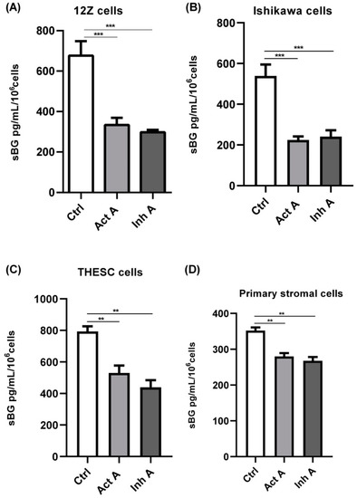 In summary, the epithelial cells exhibited a stronger reduction in BG shedding compared to stromal cells, 55% vs. 31%, respectively (Figure 3A–D). Moreover, the untreated stromal THESC cells released more sBG compared to the untreated epithelial Ishikawa cells (1.5-fold) and primary stromal cells (2.3-fold). Overall, these results confirm that activin A and inhibin A significantly suppress BG shedding in both endometrial epithelial and stromal cells.