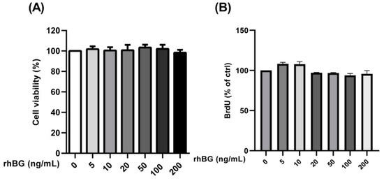 Concentration-dependent effects of recombinant BG (rhBG) on cell viability and proliferation. Endometriotic epithelial 12Z cells were treated with increasing concentrations of the recombinant BG (5–200 ng/mL) and were analyzed for cell viability (A) and proliferation (B) after 24 h using the CCK-8 and BrdU assay kits, respectively. BG treatment had no effect on the number of viable cells and cell proliferation at the concentrations tested. Untreated cells were used as a control and the mean OD of the control was set to 100%. Each bar represents the mean ± SEM of 3 independent experiments performed in duplicate. Dunnett’s test was used for statistical analysis; rhBG, recombinant betaglycan.