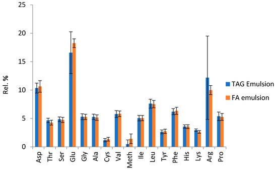 | FA emulsion | 17.1 ± 4.4 | 32 ± 2.2 | 52.8 ± 0.3 | 15.2 ± 2.4 | n.d. |