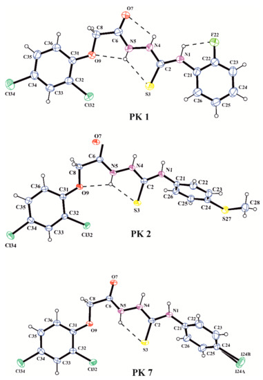 All compounds were characterized by their melting points and 1H, 13C NMR spectra. X-ray analyses performed for PK1, PK2 and PK7 unambiguously confirmed the synthesis pathway and molecular structures observed in the crystalline state of the investigated acetylthiosemicarbazide derivatives. The molecular structures of the molecules PK1, PK2 and PK7 in the conformation observed in the crystal are shown in Figure 1. The bond distances and angles in PK1, PK2 and PK7 are in normal ranges [23] and they are very similar to those observed in our previous study on acetylthiosemicarbazide derivatives [24]. Analysis of the geometry of the investigated molecules showed that PK1, PK2 and PK7 exist in N1-amino/S3-thione/N4-amino/N5-amino/O7-keto tautomeric forms in the crystalline state. This is evidenced by the C2–S3 and C6–O7 bond lengths of 1.676(4) and 1.233(5) Å in PK1, 1.668(2) and 1.238(5) Å in PK2 and 1.674(3) and 1.234(4) Å in PK7, respectively, typical for the thione and carbonyl groups (1.681(20) Å in thioureas and 1.234(12) Å in amides; [23]) and the position of the H atom in the difference electron-density map in the vicinity of N1, N4 and N5 atoms of the thiosemicarbazide chain. The conformation of the molecules is described by the torsion angles presented in Table 2. The values of the torsion angles C21–N1–C2–N4, N1–C2–N4–N5, C2–N4–N5–C6, N4–N5–C6–C8, N5–C6–C8–09 and C6–C8–O9–C31 show that the nearly planar acetylthiosemicarbazide chain adopted the trans-trans-trans-trans-cis-trans conformation in all investigated molecules. Consequently, the torsion angles C21–N1–C2–S3 and N4–N5–C6–O7 show coplanarness of the thione and carbonyl groups with the acetylthiosemicarbazide chain. A similar position to the acetylthiosemicarbazide system is taken by the 2,4-dichlorophenyl substituent in PK1, PK2 and PK7 and the 2-fluorophenyl substituent in PK1, whereas the 4-methylthiophenyl and 4-iodophenyl substituents adopted gauche conformations in PK2 and PK7, as shown by the torsion angles C22–C21–N1–C2 and C8–O9–C31–C32, respectively. The conformations of the investigated molecules are stabilized by the intramolecular N–H…X (X = O, S, F) hydrogen bonds, as shown in Figure 1 and Table 3.